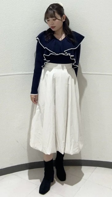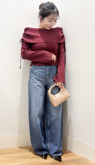 フレアスカートはもちろん、デニムを合わせてカジュアルダウンするのもおすすめ◎