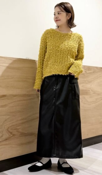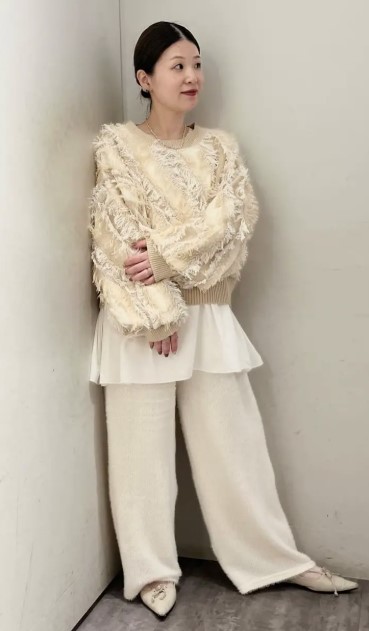 ボリューム感のあるフェザーヤーンスリーブが目を惹く、ニットアイテム。