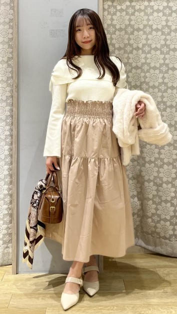 肩周りのギャザーディテールが、フェミニンなアクセントをプラス♪