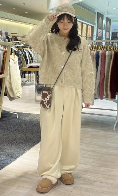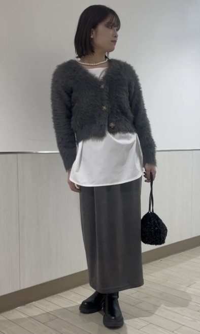 ふわふわとした毛足の長いシャギーニット素材で仕立てたカーディガン。