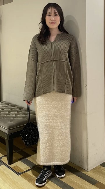 深めのVネックに腰回りまでカバーしてくれる丈感で、トレンドライクな印象に◎